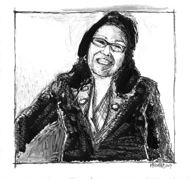 THE NATIVE AMERICAN ACTIVIST LECTURE SERIES PROJECT, PORTRAIT OF MARVEL WELCH, PHD CANDIDATE. THE NATIVE AMERICAN ACTIVIST LECTURE SERIES, PORTRAIT OF MARVEL WELCH, PhD CANDIDATE.Ink and acrylic on paper. 13″ x 13″.